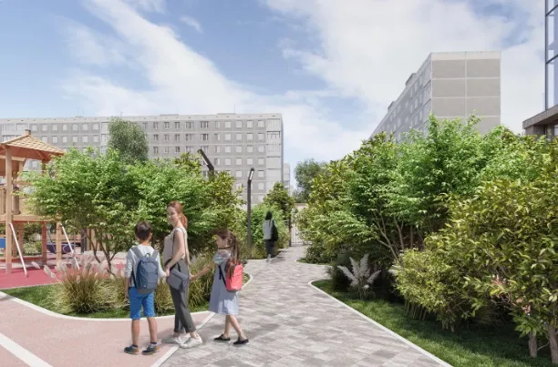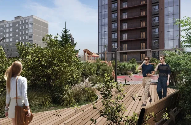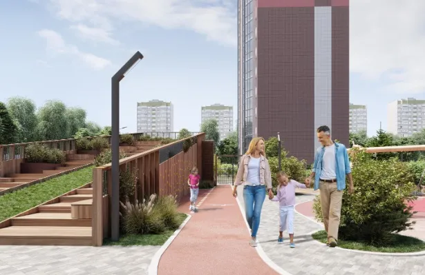 Проект был создан с учетом всех современных тенденций в строительстве. Фасад здания выполнен из керамогранита, что делает его не только красивым, но и долговечным. Внутренний двор огорожен и оборудован для комфортного использования: игровые и спортивные площадки, скалодром, амфитетатр, зоны для отдыха, бесплатный Wi-Fi и многое другое. В доме спроектированы колясочная и игровая комната на первом этаже и теплый подземный паркинг с доступом из лифта.